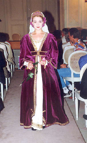 Mode der RenaissanceDie Gamurra als repräsentatives Oberkleid, hier aus lilafarbenem Samt mit Goldborten, wird nur im Brustbereich geschlossen und lässt im Ausschnitt und im Rockbereich das ebenfalls kostbar gearbeitete Untergewand sehen. Die Ärmel sind lang und bisweilen sehr weit geschnitten. |