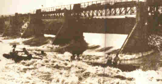 | Vorsichtig wird dann das Boot auf das Stauwehr zu gerudert und die Bomben