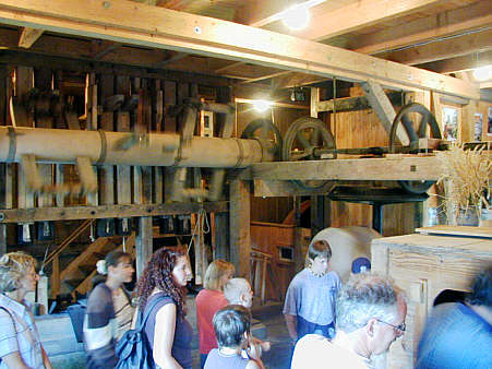 Die Hauptwelle für den Antrieb von Hollergang und Ölpresse kommt von rechts und lenkt ihre Drehbewegung auf die hintere dicke Welle um. |