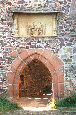Gotisches Zugangstor zum Palas mit der Inschrifttafel des 16. Jahrhunderts über das "Herkommen" der Familie.