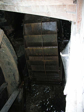 Das Wasserrad für den Antrieb der Schmiedehämmer ist im Durchmesser kleiner, kann aber pro Schaufel mehr Wasser aufnehmen und erzeugt so ein höheres Drehmoment als das große Rad für den Schleifstein