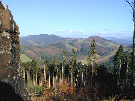 Burgruine LützelhardtBlick zur Geroldseck Blick von der Burgruine Lützelhardt nach Nordosten über das Tal des Steinbächle (mit der Passstraße über den Schönberg) zur gegenüberliegenden Burg Hohengeroldseck (rechts). Links daneben auf der isolierten Kuppe des Rauhkasten die Burgstelle der alten Burg Geroldseck. |
