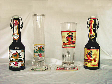 „Geroldsecker“, dunkel (rechts), und „Hieronymus“, nach Pilsner Art (links), jeweils mit den passenden Gläsern, die sich auch gut als "landestypisches" Souvenir eignen.