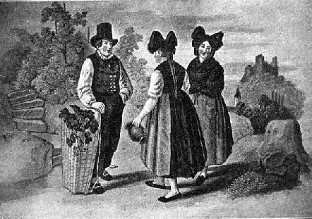 In der weiteren Entwicklung wurde zunächst die Schleife etwas mehr aus dem Kappenboden herausgehoben, dann wurde die Kappe zum kleineren Käppchen, das nur noch den Zweck hatte, den Haarknoten oder "Drüller" der Frau zu umschließen. Die Schleife verschiebt sich dann immer mehr zur vorderen Kopfhälfte und wird zur Stirnmasche, die über der Stirn hochgezogen und verschlungen wird und die Bandenden in das Gesicht herabfallen lässt Bild: Weinlese bei Müllheim, Kolorierte Lithografie, um 1820 |