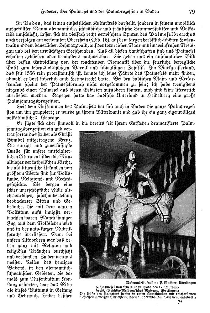 Fritz Federer: Der Palmesel und die Palmprozession in Baden. Liturgisch, kultur- und kunstgeschichtlich, volkskundlich. Mein Heimatland 21 (1934) S. 75-91 |