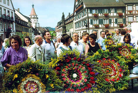 Anschließend findet auf dem Marktplatz vor dem Rathaus die Prämierung statt. Hier achten die Preisrichter vor allem darauf, daß viele Heilkräuter verwendet wurden und die Kräuterbüschel in der für Gengenbach seit vielen Jahren bestehenden Biedermeierform gebunden worden sind. |