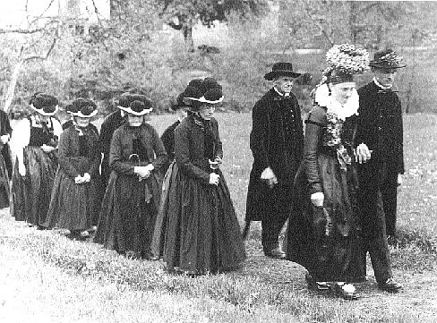 Gutacher TrachtDer HochzeitszugDieses Bild zeigt die unterschiedliche Ausstattung der Gutacher Tracht. An der Spitze das Brautpaar, die Braut trägt die Brauttracht mit Schäppel und weißem Kragen, die verheirateten Frauen dahinter den schwarzen Bollenhut zum langärmligen Kleid, die unverheirateten Frauen am Schluss den roten Bollenhut zum ärmellosen Mieder mit der weißen Bluse. |
