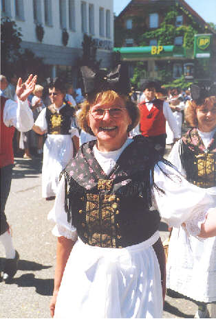 Badisches Trachtenfest 1999 in HaslachTrachten aus Marlen Kopfschmuck der Marlener Tracht ist die Schleifenhaube, die allerdings deutlich kleiner als die benachbarte Hanauer Hörnerkappe ausfällt. |