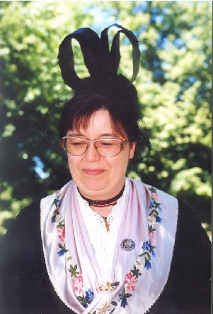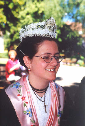 Badisches Trachtenfest 1999 in HaslachOberharmersbacher Tracht: Schleifenkappe der verheirateten Frau, Kranz der Mädchen. Charakteristisches Kennzeichen der Tracht des vorderen Kinzigtals und des Harmersbachtals ist die Schleifenkappe mit der aufgestellten schmalen schwarzen Taftschleife (rechts), die Mädchen tragen den Glasperlenkranz, wie er auch im mittleren Kinzigtal (siehe Einbach) üblich ist.. |