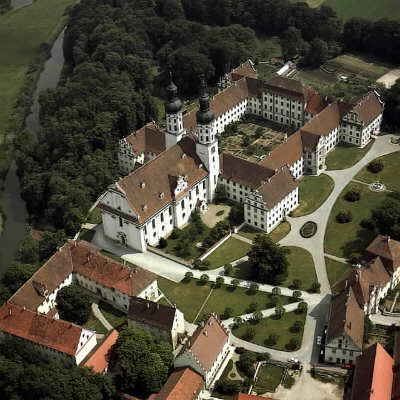Im Zentrum des Bildes die 1686 - 1701 errichtete Klosterkirche, daran im Osten anschließend der vierflügelige Konvent. Hinter der Kirche als Nordwestpavillon