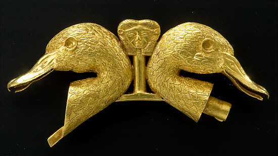 Zierat in Form von Entenköpfen mit einer Hathormaske.