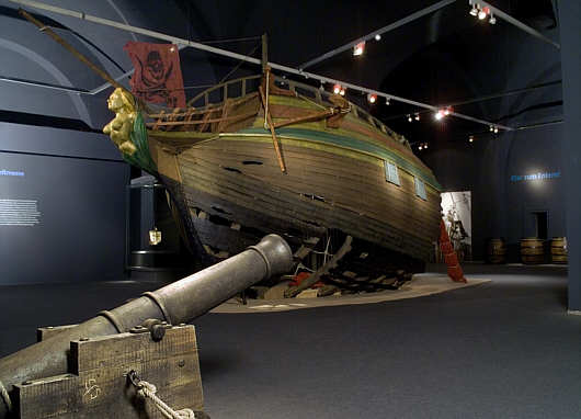 In der Kapitänskajüte liest der Kapitän aus einem Kaperbrief. © Historisches Museum der Pfalz Speyer
