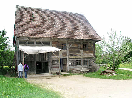 Haus in Vollholzkonstruktion aus Mennwangen (Gemeinde Deggenhausertal, Bodenseekreis), mit 1855 errichtetem hinterem Anbau. Im Erdgeschoss Dokumentation über Baugeschichte und Bauweise des Hauses.