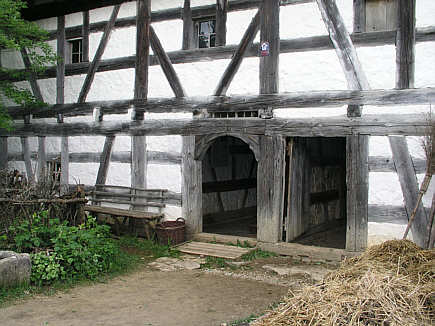 Eingangsbereich des Weber- und Kleinbauernhauses (Dautmergen, Zollernalbkreis), mit Zugang zum Wohnbereich (links) und zum Stall (rechts).