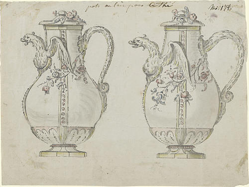 Anonym, (vielleicht Nicolas Guibal) Entwurf für ein Milchkännchen (Drachenform), um 1760 Feder in Grau über Spuren von Schwarzem Stift, grau, gelb, rosa und blau laviert/kräftiges gelbes Bütten, 18,4 x 24,5 cm
