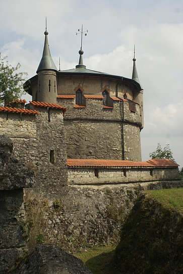 Bastion der Vorburg mit dem Kanonenturm. Der äußere Bereich der Burg bietet herrliche Ausblicke ins Tal der Echaz.
