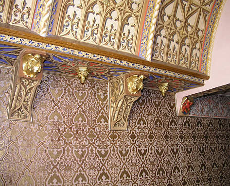 Vergoldete Balkenköpfe und Maßwerkmalerei in der Spitztonnendecke des Großes Erkerzimmer genannten Gästezimmers.
