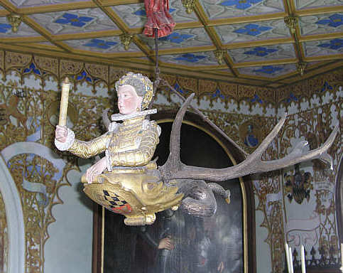 Lüsterweibchen über dem großen Tisch: Frauenoberkörper in der Kleidung der Renaissance, mit dem Unterkörper eines Fisches, auf zwei Hirschstangen montiert. An der Stirnseite das viergeteilte württembergische Wappen.