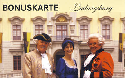Mit der Bonuskarte ist jeweils die vierte Sonderführung im Jahr kostenlos.Mit der achten Sonderführung wartet eine kleine Überraschung auf Sie. Die Bonuskarte gilt ausschließlich für das Residenzschloss Ludwigsburg und Schlos Favorite