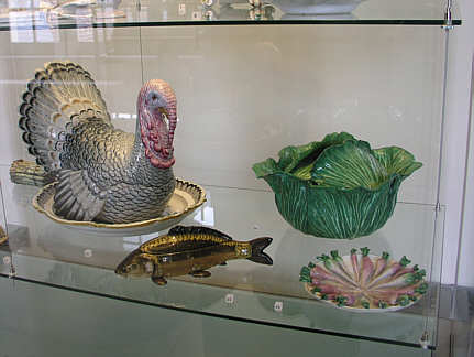 Terrinen in Form eines Truthahns, eines Kohlkopfs und eines Fischs, daneben ein Teller mit Rettichen