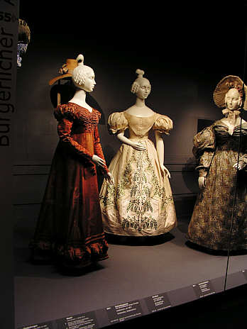 In der Zeit des Biedermeier, die politisch in die Zeit des Vormärz übergeht, rückt die Mode wieder deutlich von der Linie des Empire ab. Die Taille sinkt auf ihre natürliche Position und wird wieder eng geschnürt, Röcke und Ärmel werden voluminöser.