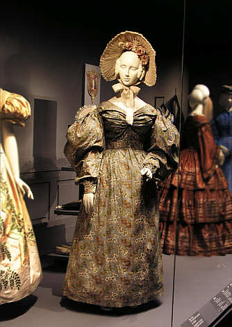 Um 1830 sind stark aufgebauschte Ärmel in Mode, "Hammelkeulenärmel" genannt. Das Kleid ist mit einer zeitgenössischen Strohschute als Kopfbedeckung kombiniert.