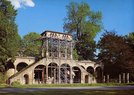 Neues Lusthaus Reste der Freitreppe, 1904 in den Schlossgarten verbracht, stark vom Verfall bedroht. |