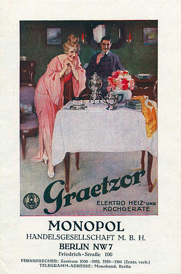 Graetzor Elektro Heiz- und Kochgeräte Faltblatt, 1938 Original, Teekocher Graetzor - Elektro Samowar Monopol 10,6 x 16 cm © Museum für Energiegeschichte(n)