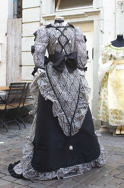 Trauerkleid aus zwei verschiedenen Papieren mit schwarzer Taillenschleife und handgedrehten Papierzäpfchen am Brustteil.