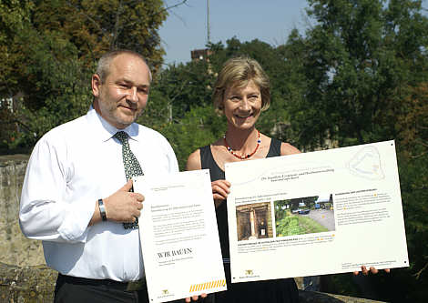Dipl. Ing. Thomas Schulz und LRDin Raphaela Sonnentag präsentieren die mit der Baustelle mitwachsenden Informationstafeln, die zum neuen Konzept der umfassenden Besucherinformation gehören.