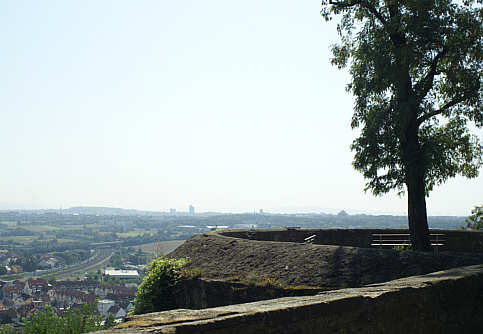 Einmaliger Ausblick: Der Ludwigsburger Ballungsraum, von der Höhe der ehemaligen württembergischen Landesfestung Hohenasperg aus gesehen. Im Vordergrunf das Rondell der jetzt für die Dauer der Bauarbeiten abgesperrten Hügelsburg.