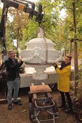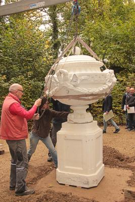 Moritz helfen tatkräftig mit, die 700-Kilo-Vase an Ort und Selle