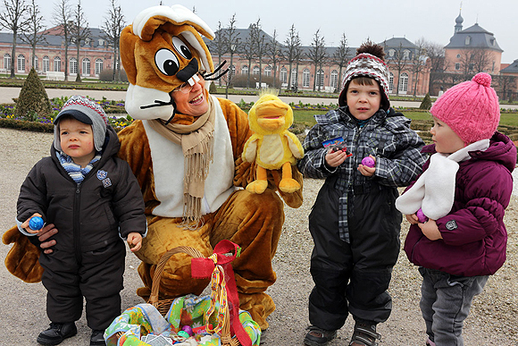 hat, trifft bei der Ostereisuche im Schlossgarten sogar den Osterhasen