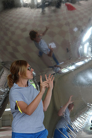 monumentale Skulptur, aufblasbar und aus silbrig spiegelndem Kunststoff,