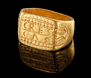 Aalen, Bischof-Fischer-Straße / Stuttgarter Straße. Goldener Kinderring mit der Aufschrift CRESCAS. Foto: Landesamt für Denkmalpflege im RPS