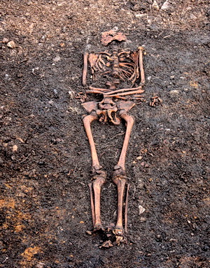Rätsel gibt derzeit noch der Fund eines Skeletts auf, das der Bodenstratigrafie und dem Fundmaterial zufolge spätestens in das 16./17. Jahrhundert datiert. Aufgrund der Körperhöhe von lediglich 1,60 m und dem eher schmalen Körperbau dürfte es sich nach einer ersten Einschätzung um eine jugendliche Person handeln. Die relativ gut erhaltenen Knochen lagen in einer kaum sichtbaren Grabgrube, die wiederum in einer weiteren Grube bzw. Schicht eingetieft war. Die Arme waren zeittypisch über dem Bauch überkreuzt, die Hände lagen im Beckenbereich und die Füße waren dicht beieinander angeordnet. Dies deutet darauf hin, dass der Leichnam bei seiner Niederlegung in ein Tuch gehüllt war. Für weitergehende Aussagen zu diesem unerwarteten Fund müssen die anthropologischen Untersuchungen abgewartet werden.