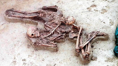 Skelett eines Mannes und eines Kindes auf der Sohle einer keltischen Vorratsgrube. Foto: Christian Bollacher, Landesamt für Denkmalpflege im RP Stuttgart