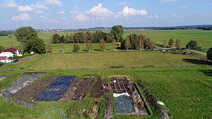 Oben: Drohnenaufnahme der Grabungsschnitte mit Blick über das Federseebecken (oben). Die bereits ausgegrabenen Schnitte sind hangabwärts schon wieder mit Wasser gefüllt. Foto: Landesamt für Denkmalpflege im RP Stuttgart