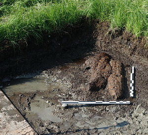 Unten: Holzreste während der Ausgrabung. Die Oberfläche ist schon stark verwittert, eine menschliche Bearbeitung ist schwierig zu erkennen. Foto: Landesamt für Denkmalpflege im RP Stuttgart