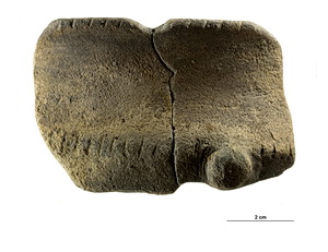 Mitte: Verziertes Keramikfragment aus der Jungsteinzeit, mit zwei Kerben versehen als Netzsenker recycelt. Foto: Landesamt für Denkmalpflege im RP Stuttgart