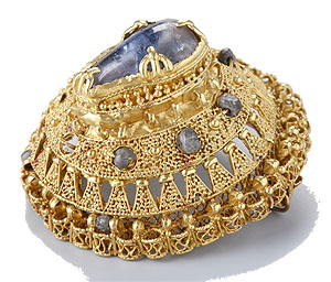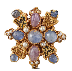 Fibel mit Trommelkranz. 10. u 11.Jh. Gold, Saphir, Perlen. Kunstgewerbemuseum Berlin. Foto W. Fuhrmannek, HMLD. Inv. O 1961 53