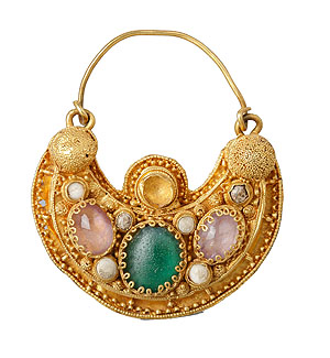 Goldener Halbmondohrring aus dem kleinen Schatzfund im Hof der Mainzer Stadionerhof-Kaserne, gef. 1904. Landesmuseum Mainz. Foto W. Fuhrmannek, HLMD