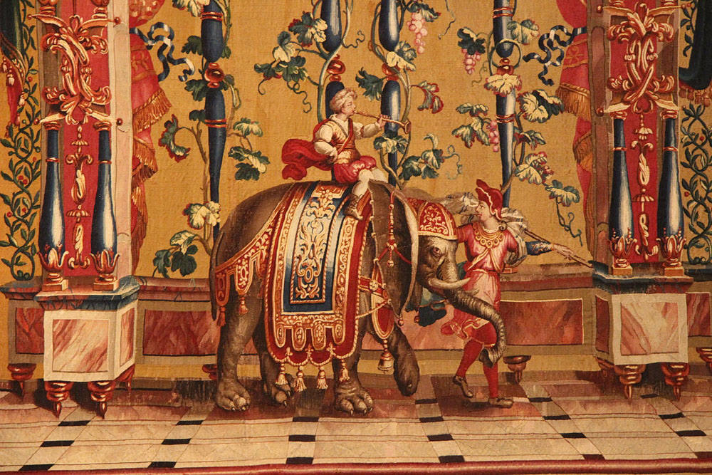 Mit Löwenfüßen, verdrehten Ohren und einem Rüssel, der dem Brausekopf einer Gießkanne ähnelt: Einer der Wandteppiche in Schloss Bruchsal zeigt einen ganz besonderen Elefanten. Auf dem Rücken des festlich geschmückten Dickhäuters sitzt sein Treiber. Die Tapisserie „Elefantentreiber“ gehört zur sogenannten „Groteskenfolge“ im Jagdzimmer von Schloss Bruchsal. Sie entstand zwischen 1685 und 1719 im nordfranzösischen Beauvais. Den Gästen des Fürstbischofs fielen die seltsamen Details der Elefanten-Gestalt wohl nicht weiter auf. Im 18. Jahrhundert gab es in Europa nur wenige Menschen, die einen Elefanten zu Gesicht bekamen. Es waren vor allem Adelige, die in ferne Länder oder an die Höfe bedeutender Regenten reisen konnten, wo Elefanten und andere exotische Tiere zum Hof gehörten.