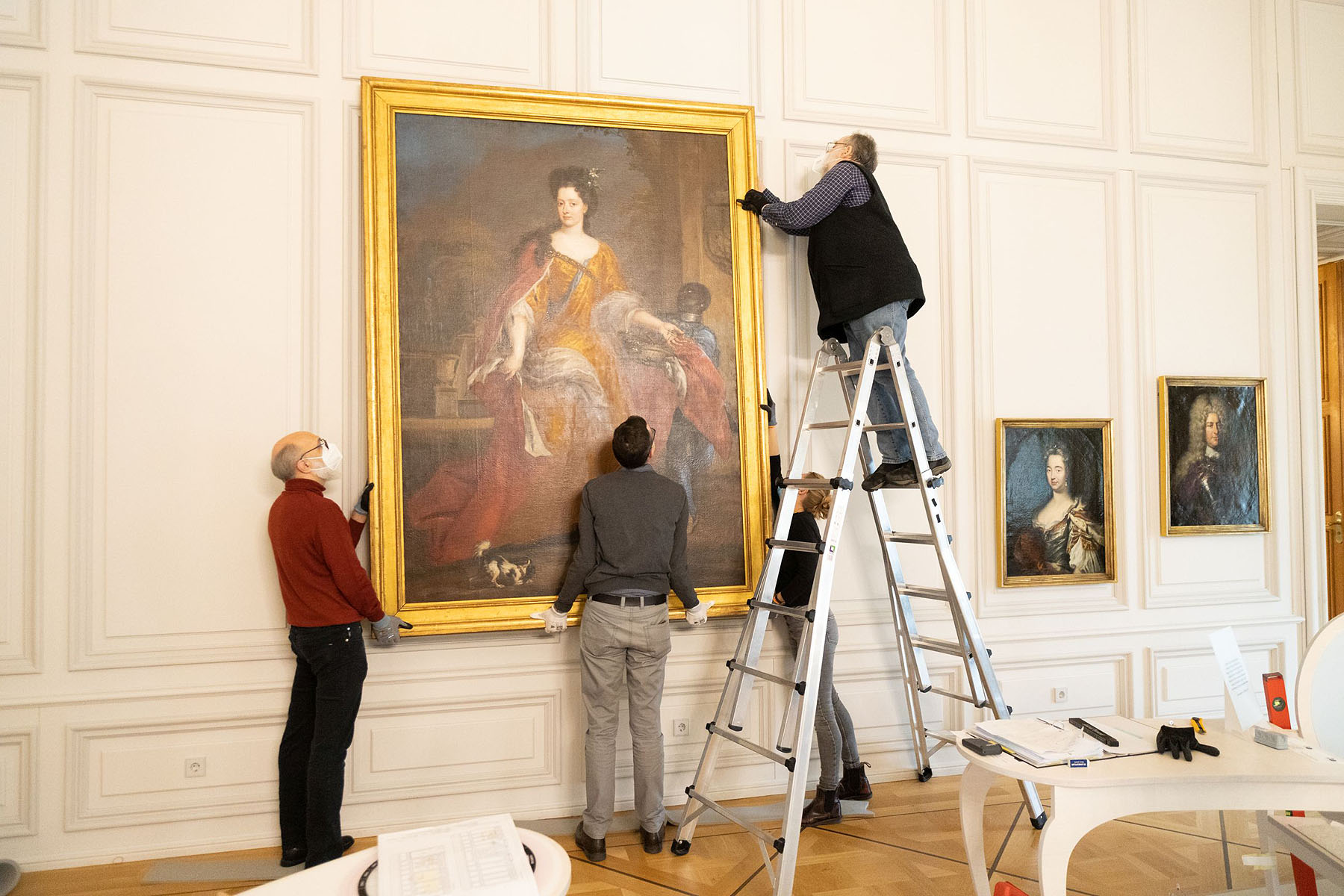 Die Arbeit der Staatlichen Schlösser und Gärten Baden-Württemberg an der Ausstattung des neuen Hofmusikraums geht weiter: Heute wurden weitere Exponate fachmännisch angebracht. Es handelt sich dabei um vier Gemälde, die ehemals Bestandteile der berühmten Kurpfälzer Galerie waren. Die in der Düsseldorfer Residenz von Kurfürst Johann Wilhelm 1709 gegründete Galerie, zu der neben Gemälden auch Marmorfiguren, Barometer und Uhren gehörten, war teilweise 1731 mit Kurfürst Carl Philipp in das neue Schloss nach Mannheim umgezogen. Kurfürst Carl Theodor erweiterte die Galerie – ihr Platz befand sich im Bibliotheksgebäude im Westflügel. Im Zuge der Übersiedlung Carl Theodors nach München kamen die meisten Gemälde dorthin – nun kehren vier von ihnen als Dauerleihgaben der Bayerischen Staatsgemäldesammlungen an ihren früheren Standort zurück.