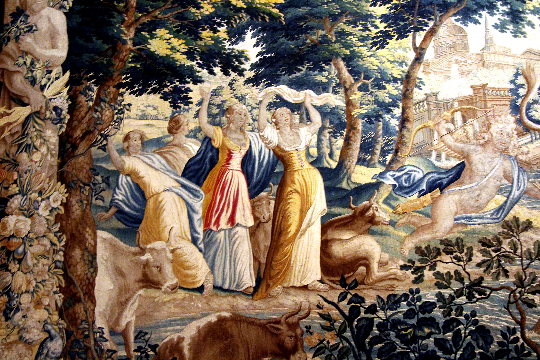 Auch diese drei netten Damen begrüßen die Gäste am Weltstudierendentag: Ausschnitt aus einem Teppich der Serie "Die Verwandlung des Jupiter". Foto: kulturer.be