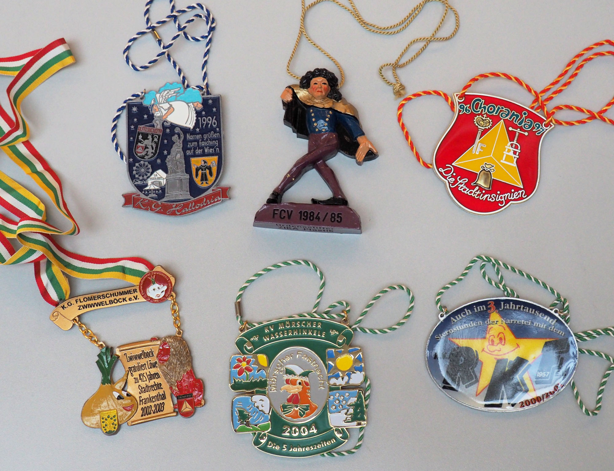 Auch die jetzt ausgestellte kleine Auswahl an Karnevalsorden einiger Frankenthaler Vereine zieren vielfältige Motive. Stadtgeschichtlich geht es zu auf den Orden der Flomerschumer Zwiwwelböck, K.G. Hallodria und Chorania e.V. Die Orden des Frankenthaler Carneval Vereins und die Mörscher Wasserhinkele zeigen karnevalistische Motive während der Karnevalsverein Rosenkavaliere mit dem Hinweis auf das 3. Jahrtausend Zeitgeschichte aufgreift.