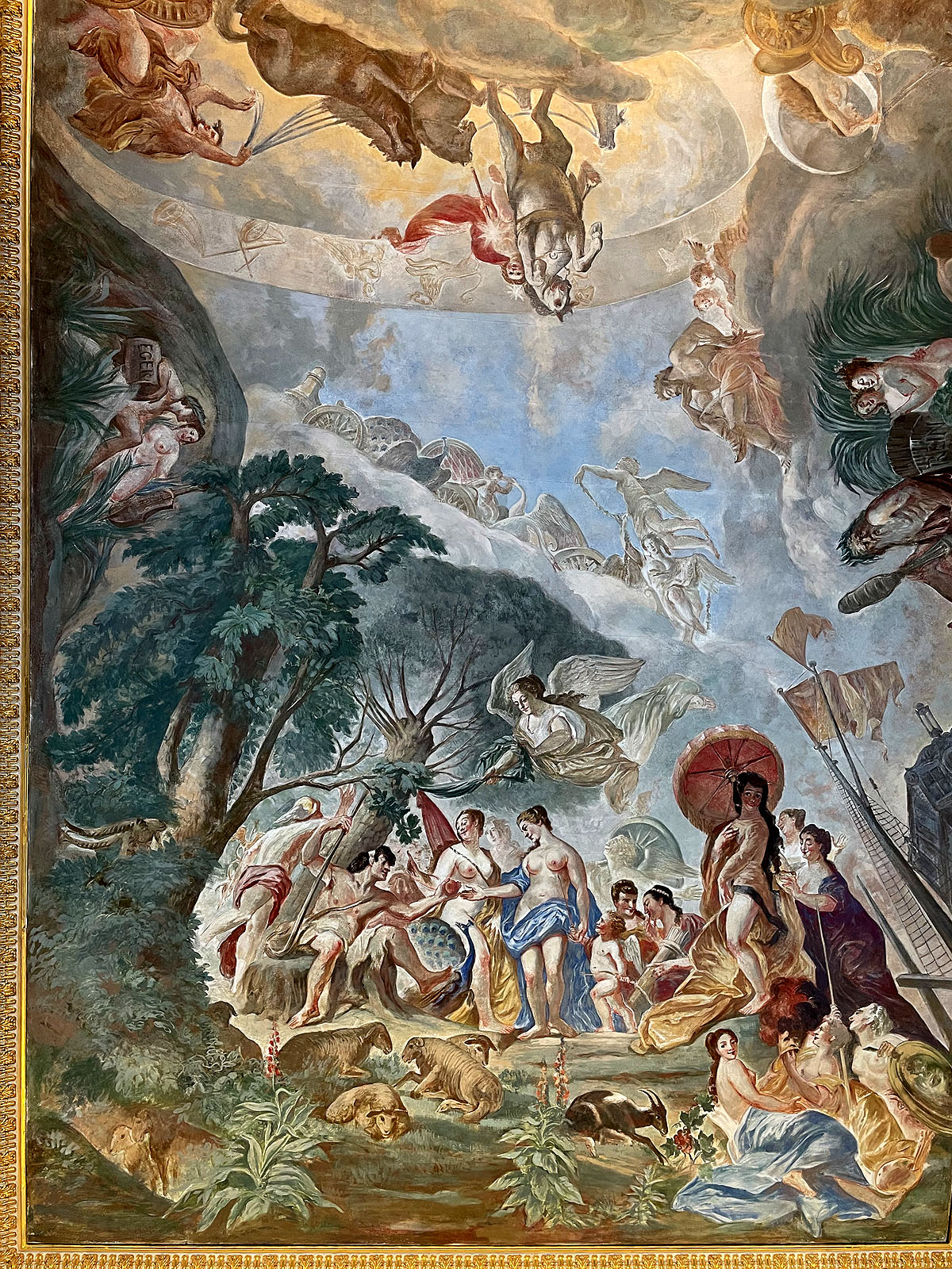 Das Urteil des Paris. Deckenmalerei von Cosmas Damian Asam im reppenhaus des Mannheimer Residenzschlosses, nachempfunden beim Wiederaufbau des Schlosses von Carolus Focke 1957. Foto: kulturer.be