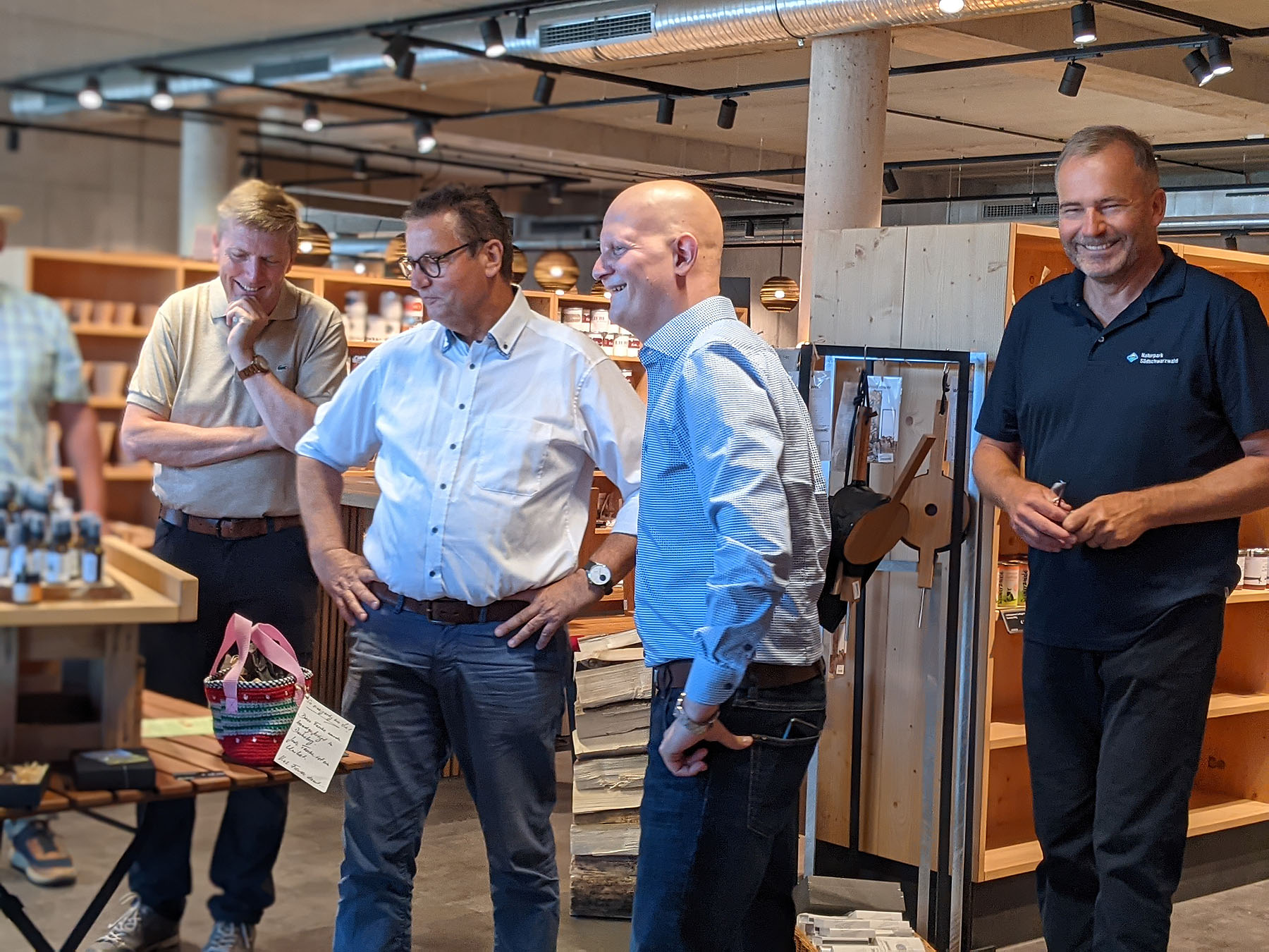 „Der Landmarkt WÄLDER:Genuss ist ein Familienunternehmen mit einer klaren Handschrift. Was uns verbindet, ist die Begeisterung für den Schwarzwald und für alles Gute, das hier entsteht. Im Markt und in unserer Gastronomie bieten wir sorgfältig ausgewählte Schwarzwald-Produkte an“, so Johannes Pokrzywa, Inhaber und Geschäftsführer WÄLDER:Genuss. Minister Peter Hauk zieht das Fazit: „Naturpark-Marktscheunen wie der WÄLDER:Genuss bringen die Themen der nachhaltigen Regionalvermarktung und -versorgung perfekt zusammen. Gerade im ländlichen Raum, in dem sich die Naturparke befinden, ist die Versorgung mit Produkten aus der Region elementar.“ Roland Schöttle, Geschäftsführer des Naturpark Südschwarzwald ergänzt: „Mit dem WÄLDER:Genuss gibt es die zweite ausgezeichnete Naturpark-Marktscheune im Südschwarzwald. Solche Vermarktungsstrukturen stärken die landwirtschaftlichen Betriebe im Naturpark durch eine hohe Wertschöpfung in der Region. Ziel ist es, die Regionalität zu stärken, gleichzeitig profitieren Einheimische und Besuchende von dem vielfältigen Angebot. Heimische und gesunde Lebensmittel sind zudem ein ganz konkreter Beitrag zum Klimaschutz.“ Die „Naturpark-Marktscheune“ WÄLDER:Genuss bündelt hochwertige Schwarzwald-Produkte und präsentiert sie liebevoll in einladendem Ambiente. Von der hohen regionalen Qualität der Produkte konnten sich Minister Hauk und die Teilnehmenden selbst überzeugen: Unter dem Motto „Alles Gute aus dem Schwarzwald“ findet sich im Markt eine große Auswahl bester Schwarzwälder und badischer Lebensmittel sowie Alltagsgegenstände – gefertigt aus heimischen Werkstoffen für Designverliebte und Geschenkefans. Auch das Projekt „Blühender Naturpark“ findet sich auf den insektenfreundlich gestalteten Außenflächen der Naturpark-Marktscheune wieder.