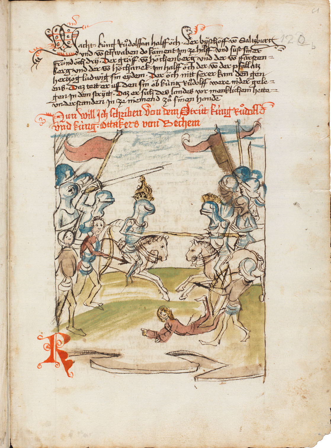 Die Chronik von den 95 Herrschaften (Königsfelden, 1479–1482) erzählt die Geschichte des Aufstiegs der Habsburger Herrscher. Diese Seite zeigt den Zweikampf zwischen Rudolf I. und Ottokar II. in der Schlacht von Dürnkrut. Bild: Bern, Burgerbibliothek, Cod. A 45, fol. 61r – Österreichische Chronik der 95 Herrschaften
