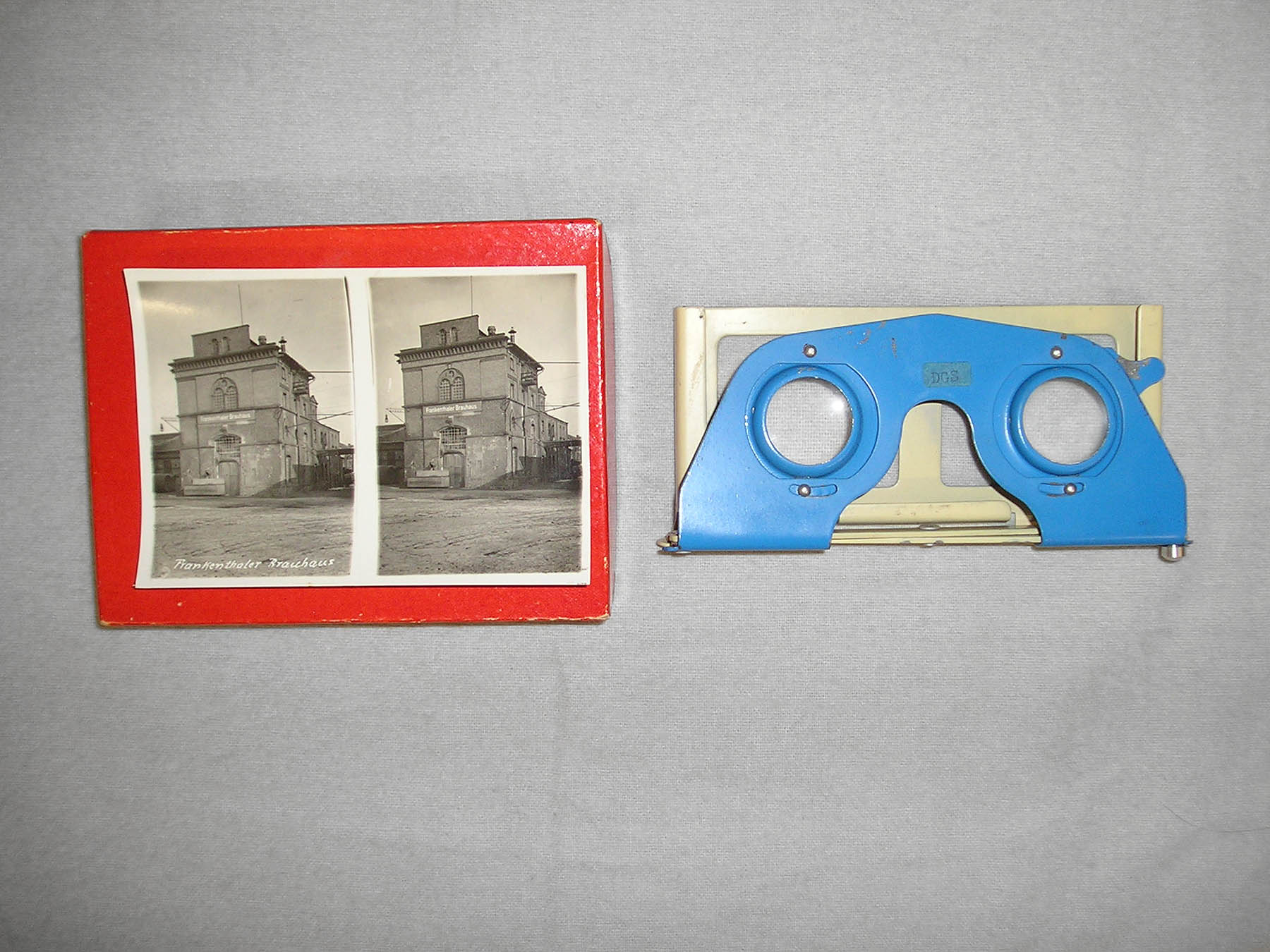 Bei einem Stereoskop handelt es sich um eine vergleichsweise einfache Konstruktion zum Betrachten von Stereobildern auf Glas oder Papier. Ein ausklappbares Untergestell verbindet den Lupenträger mit den zwei Betrachtungslupen mit dem Bildträger. Legt man die speziell angefertigte, leicht versetzte, Doppelaufnahme ein, ensteht der Eindruck dreidimensionaler Bildtiefe. Zum Objekt gehört eine dreißigteilige Bildserie spezieller Fotos mit Motiven des ehemaligen Frankenthaler Brauhauses, die auf der Website des Erkenbert-Museum www.frankenthal.de/erkenbert-museum als Bildergalerie präsentiert werden.
